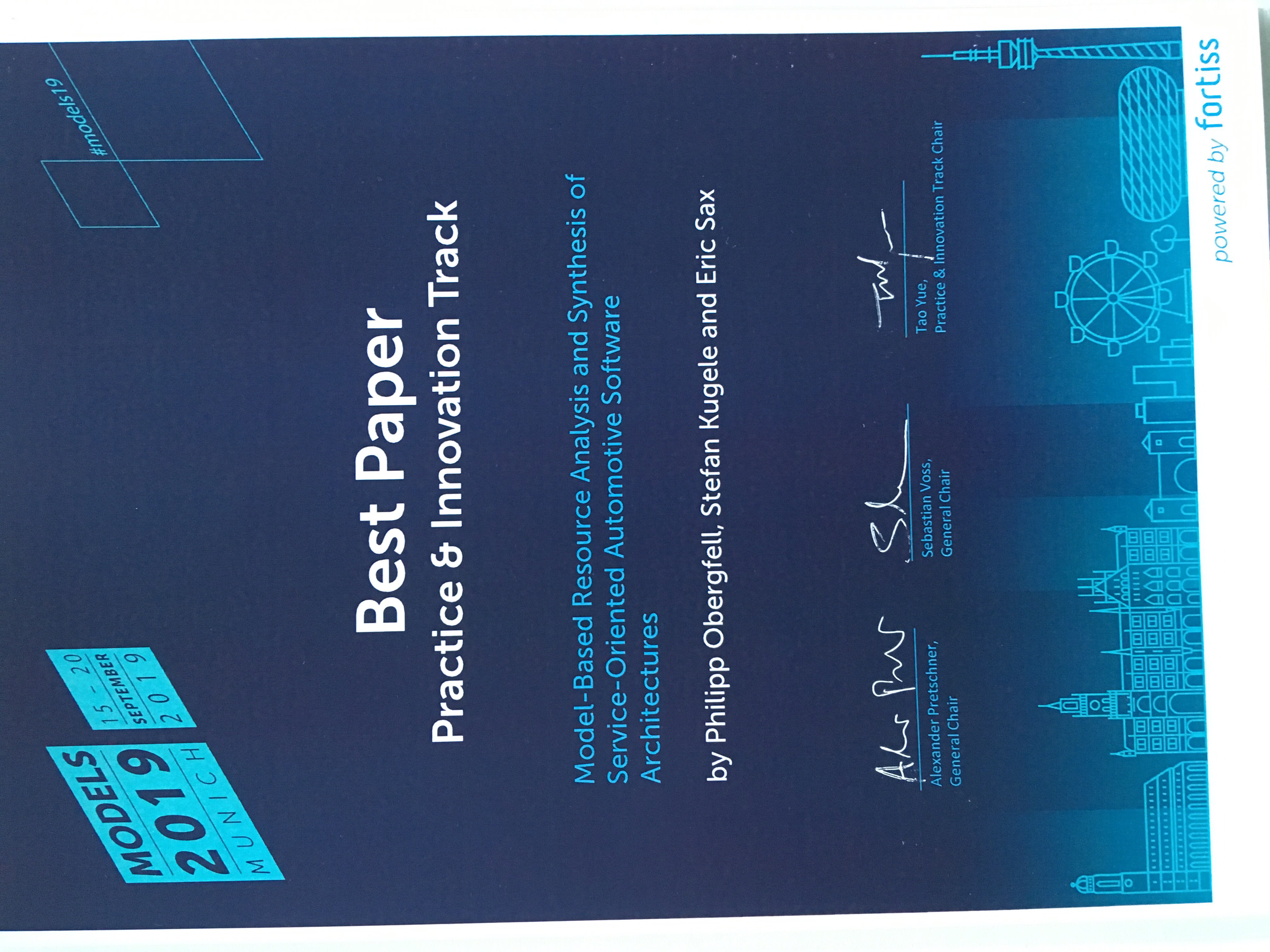 Auto Electronic Excellence Award für Raphael PfefferFür ihr Paper "Model-Based Resource Analysis and Synthesis of Service-Oriented Automotive Software Achitectures" erhielten Philipp Obergfell, Stefan Kugele und Eric Sax einen Best Paper Award im Practice und Innovation Track der IEEE / ACM 22nd International Conference on Model Driven Engineering Languages and Systems (MODELS), die vom 15. bis 20. September 2019 in München stattgefunden hat.